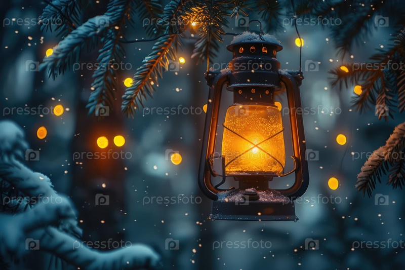 Винтажный фонарь, тепло светящийся среди снежного леса с мерцающими огнями на заднем плане
