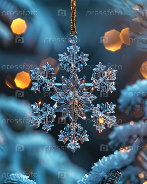 Кристаллический орнамент снежинки, висящий на украшенном дереве с мягкими огнями боке на заднем плане