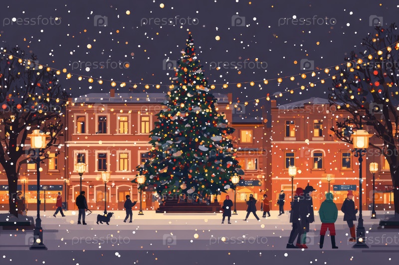 Праздничная зимняя сцена с зажженной елкой и людьми, наслаждающимися снегом на городской площади