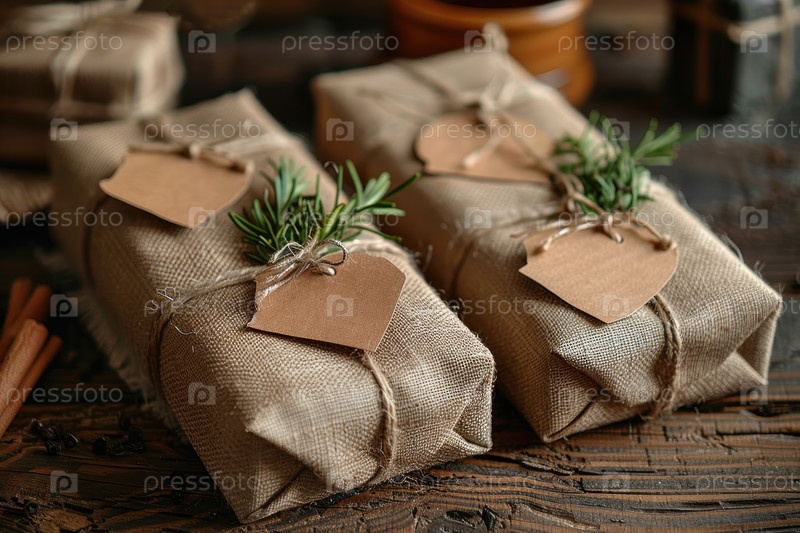 Рустические подарочные сумки, упакованные в мех с двойными и свежими травами на деревянном столе