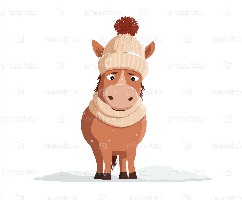 Милая мультфильмовая лошадь в уютной шляпе и шарфе на иллюстрации снежного зимнего пейзажа