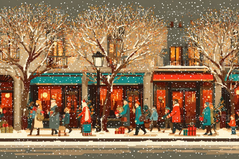 Зимняя уличная сцена с людьми, делающими покупки и падающим снегом в праздничной городской среде