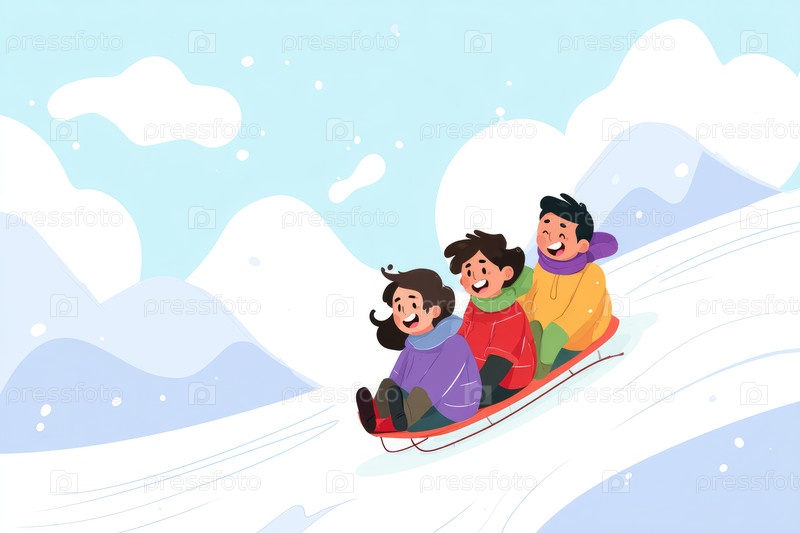 Трое детей счастливо катаются на лыжах с заснеженного холма в красочной зимней одежде с горами на заднем плане