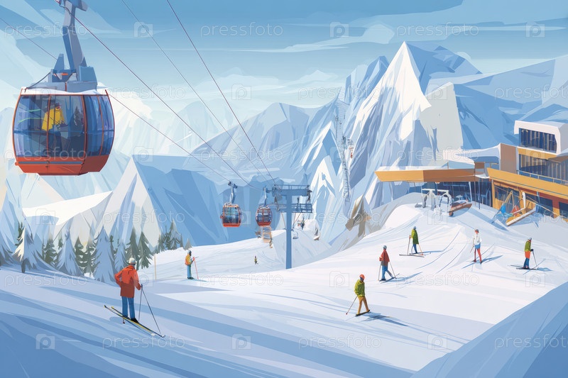 Лыжники наслаждаются зимними видами спорта на заснеженных склонах с гондолами и горными пейзажами в фоне