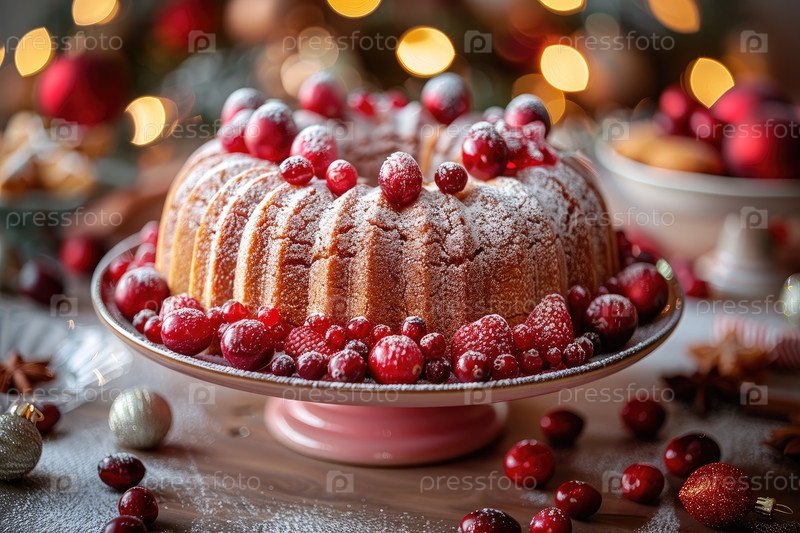 Торт от праздничных беспорядков, украшенный свежими клюквами и сахарным порошком на декоративной тарелке