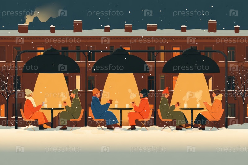 Уютная сцена уличного кафе с людьми, наслаждающимися теплыми напитками зимой под большими лампами