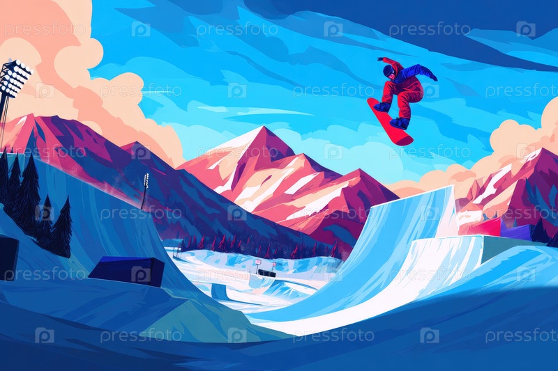 Сноубордист выполняет трюки в ярком зимнем пейзаже с горами и пандусами