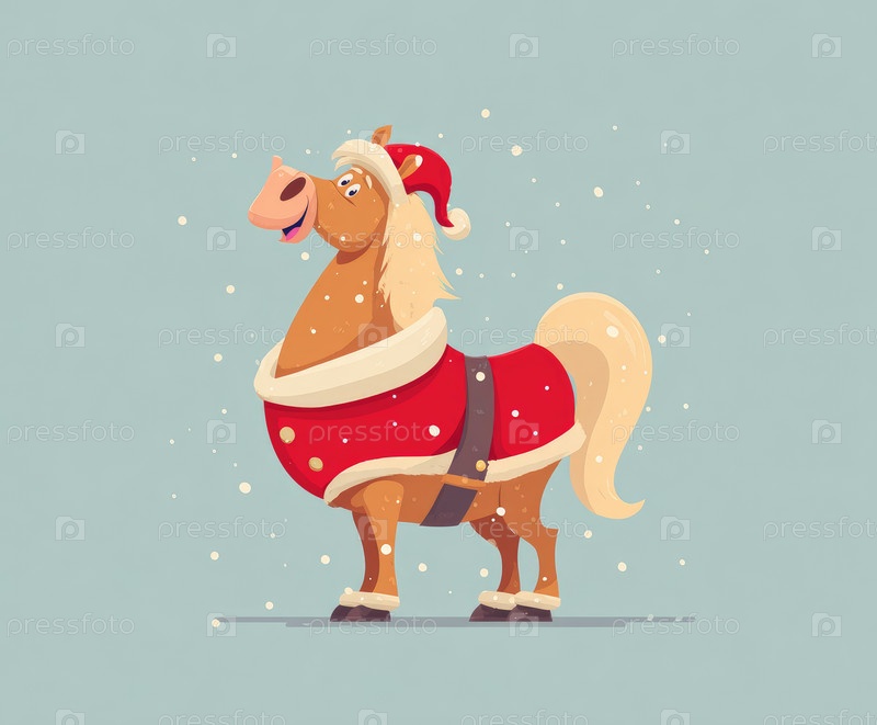 Забавный мультфильмовый конь в праздничном красном наряде и шляпа Санты в снежной зимней сцене