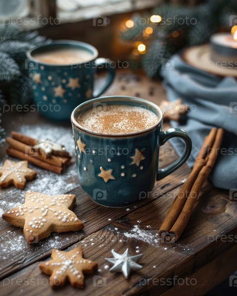 Уютная праздничная сцена с кружками звезд, палочками корицы и праздничными печеньями на деревянном столе