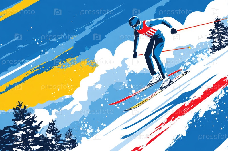Динамичный лыжник бежит по снежному склону с яркими цветами и стилизованным горным фоном