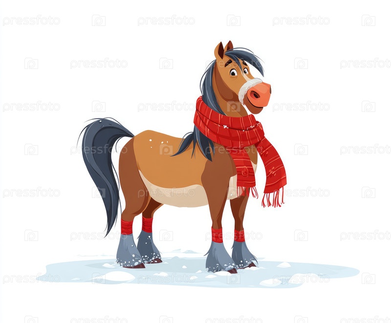 Мультипликационная лошадь с дружелюбным выражением лица, одетая в ярко-красный шарф и обогреватели ног, стоит в снежном пейзаже, показывая игривую зимнюю тему и яркие цвета