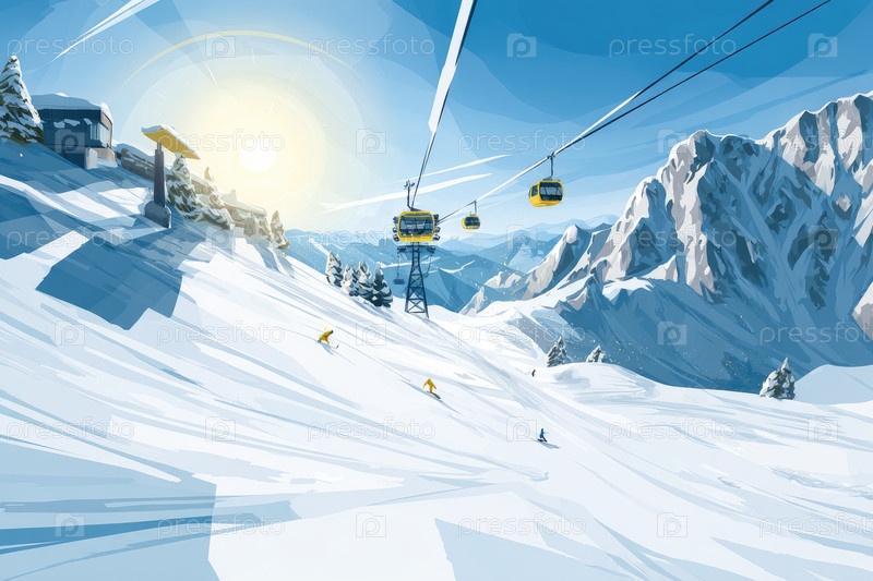 Снежный горный пейзаж включает в себя подъемники, перевозящие лыжников, с ярким солнечным светом, освещающим сцену, демонстрируя красоту зимних видов спорта и спокойную атмосферу снежной местности