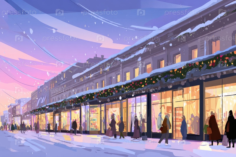 Зимняя уличная сцена с яркими витринами, украшенными декорациями, когда люди гуляют по снегу, наслаждаясь праздничной атмосферой и теплым светом витрин во время сумерек