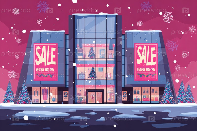Красочный торговый центр, украшенный большими вывесками и праздничными декорациями, окруженный заснеженными деревьями, создает веселую зимнюю атмосферу, идеально подходит для рождественских покупок