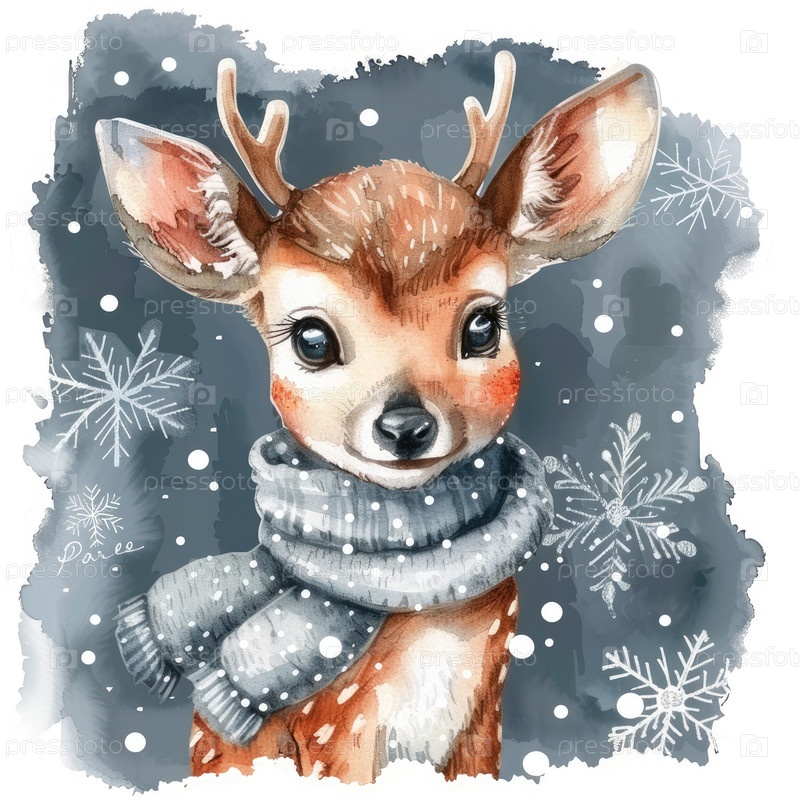 Очаровательная иллюстрация оленя показывает обаятельного молодого оленя в уютном шарфе, окруженного снежным зимним пейзажем с падающими снежинками, создавая странную и праздничную атмосферу