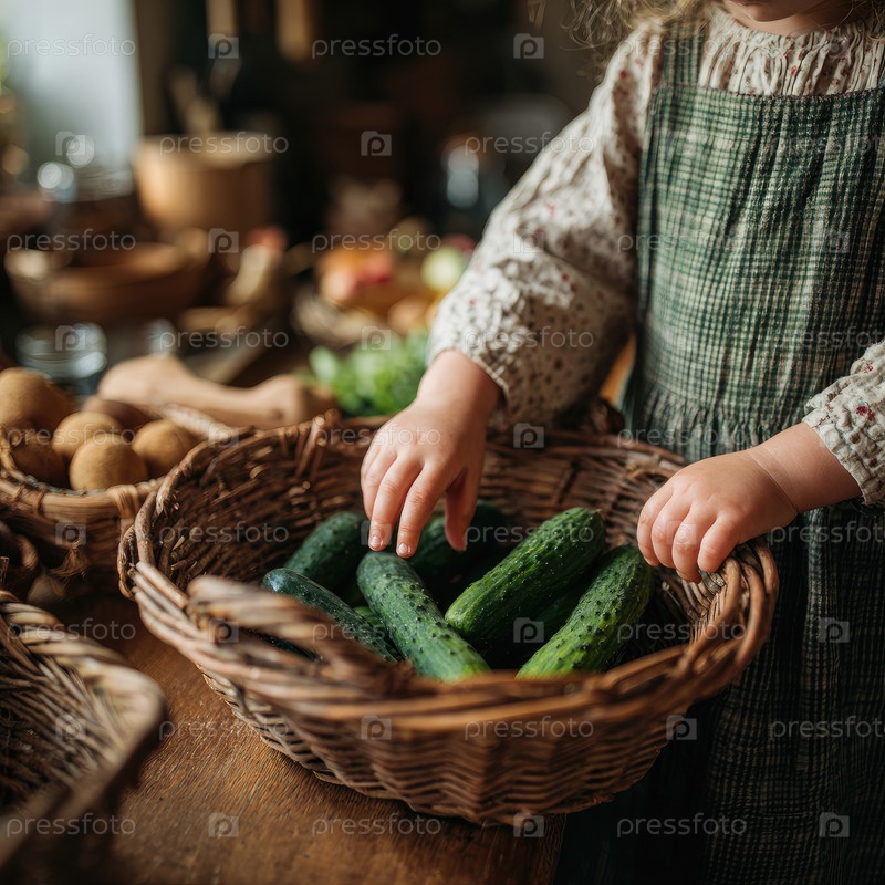 Молодая девушка в деревенской кухне тщательно выбирает свежие огурцы из плетеновой корзины, окруженной множеством красочных продуктов питания, создавая теплую и привлекательную атмосферу для приготовления пищи