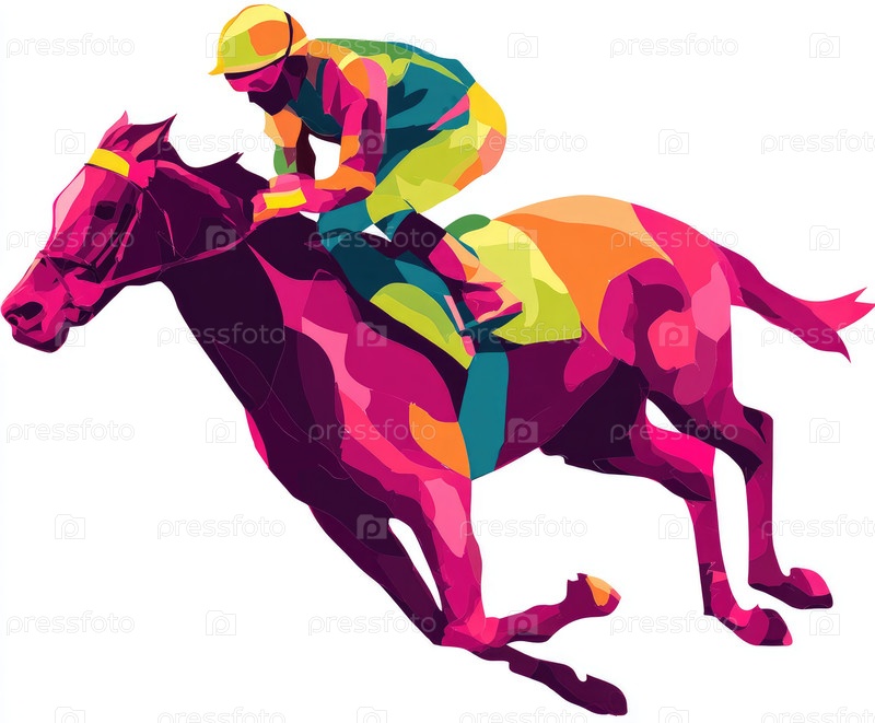 Красочная 3D-иллюстрация жокея, бегущего на ярком коне в динамическом движении