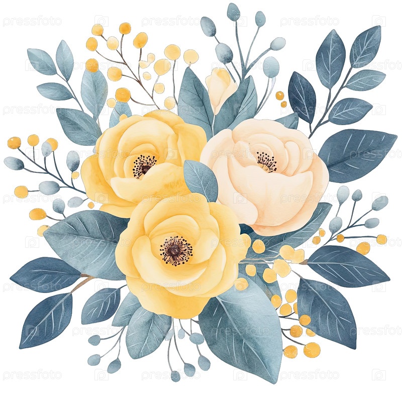 Желтые розы, красиво устроенные с мягкими зелеными листьями и нежными акцентами, создают очаровательный цветочный дисплей, идеально подходит для улучшения любого декора с прикосновением элегантности и естественной красоты