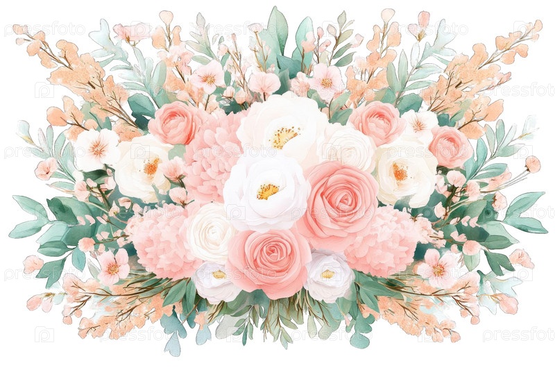 Эта потрясающая цветовая аранжировка имеет мягкие розовые и белые розы, окруженные пышной зеленью и нежными цветами, создавая яркую и свежую атмосферу, идеальную для любого случая