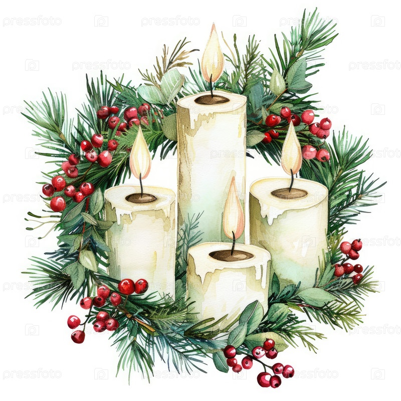 Четыре зажженные свечи в окружении праздничных зеленых и красных ягод для праздничного украшения