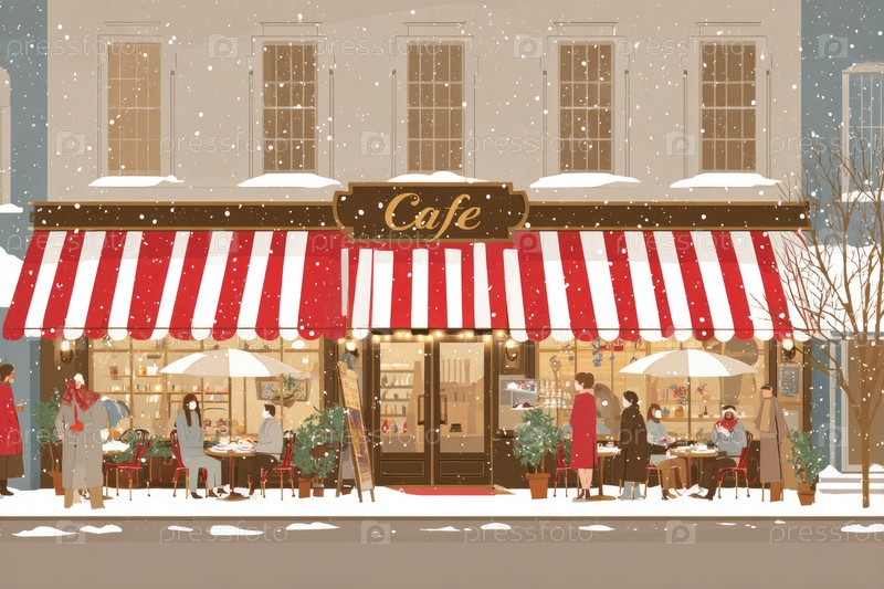 Уютная зимняя кафе-сцена со снегом, уличными сиденьями и праздничным украшением для теплой атмосферы
