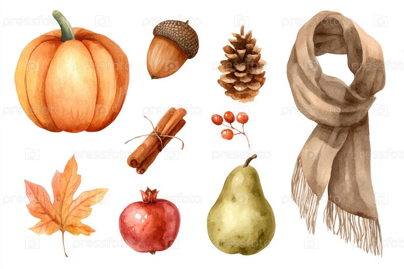 Акварельная иллюстрация элементов осеннего урожая, включая тыкву, желудок и шарф