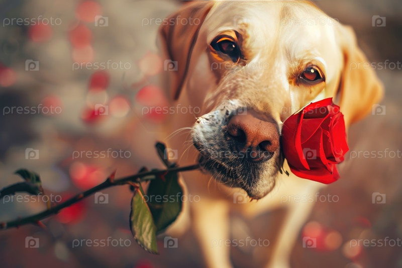 Лабрадор-ретривер держит в рот красную розу, окруженную рассеянными лепестками