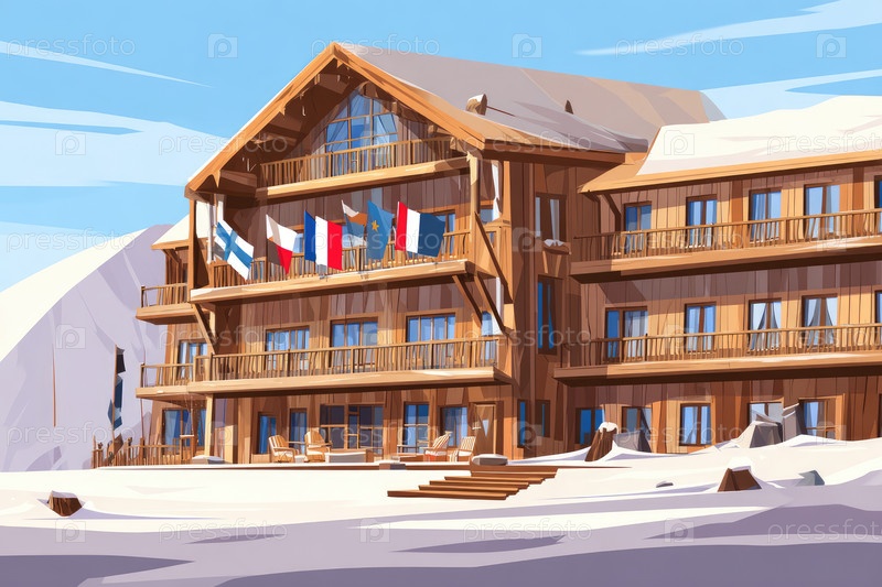 Уютный деревянный домик с флагами, в окружении заснеженных гор и чистого голубого неба