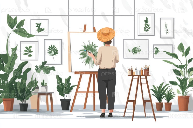 Иллюстрация художника, рисующего растения в яркой студии, полной рамочной зелени