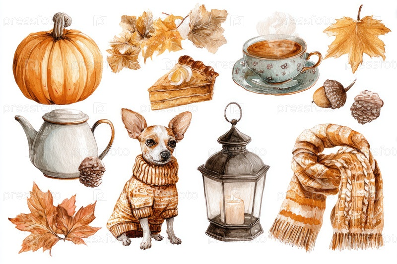 Осенний уютный акварель с собакой, тыквой и чаем