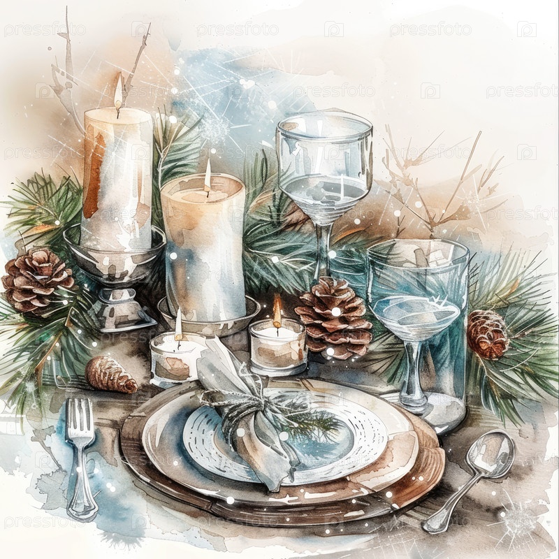 Акварельный декор рождественского стола свечами, сосновыми ветвями, конусами, стаканами и тарелками.Идеально подходит для зимних открыток, приглашений и праздничного украшения