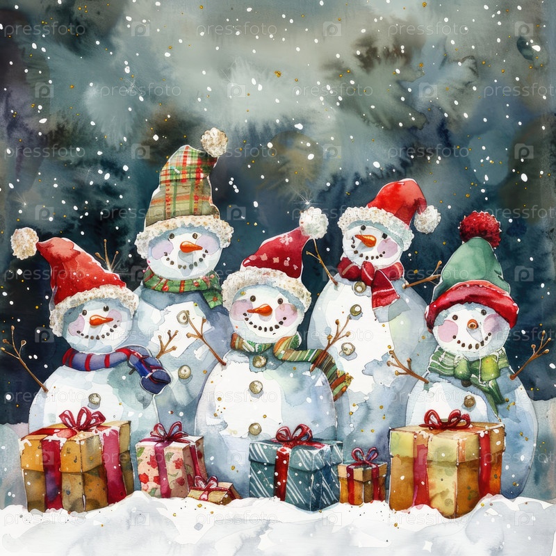 Группа праздничных снеговиков с подарками акварели