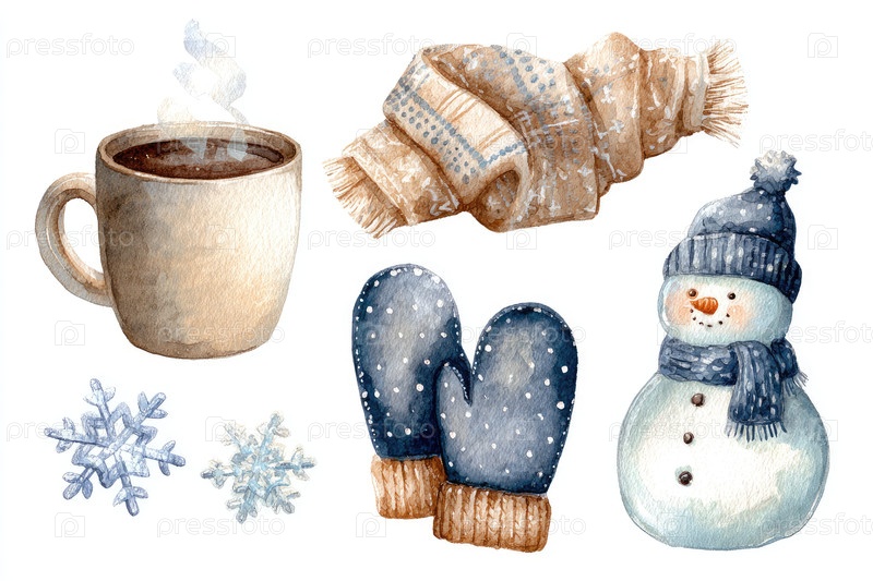 Уютная зимняя иллюстрация, показывающая поднимающуюся чашку горячего напитка, мягкие перчатки, рисунковый шарф, веселого снеговика и нежные снежинки, создающие теплую сезонную атмосферу