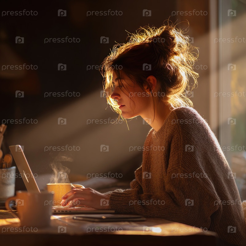 Молодая женщина с коричневыми волосами работает на ноутбуке в уютной обстановке в комнате с теплым солнечным светом