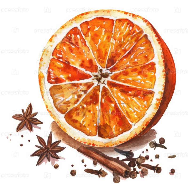 Илюстрация акварели с ярко нарезанным апельсином, окруженной ароматическими специями и палочками корицы на деревянной поверхности, показывающая богатую текстуру и цвета ингредиентов