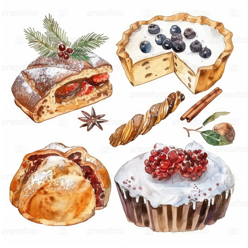 Эта праздничная акварельная иллюстрация демонстрирует множество праздничных десертов, включая пирог с ягодами, шоколадную булочку и выпечки, окруженные специями и зеленью для радостной атмосферы