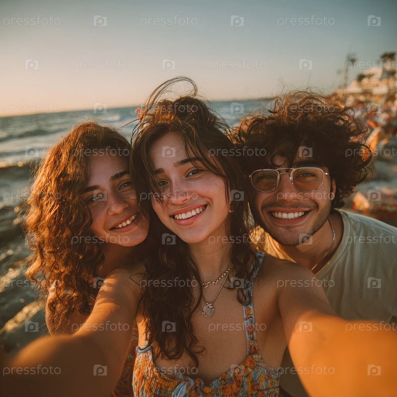Трое друзей делают радостное селфи на пляже во время захода солнца, при этом волны мягко разбиваются в фоне и теплый золотой свет освещает их счастливые лица и беззаботную атмосферу