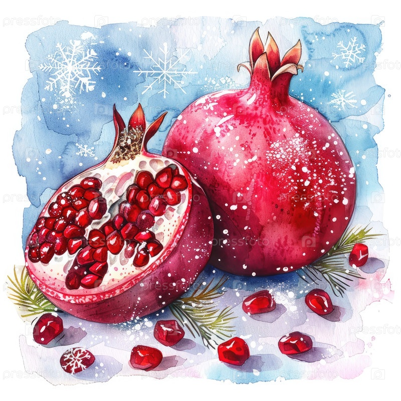 Илюстрация акварели с двумя гранатами, один разрезанный на кусочки, окруженные разбросанными семенами и ветвями сосны, установленная на снежно-синем фоне, вызывая зимнюю атмосферу