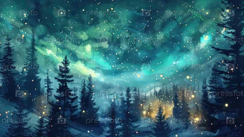 Очаровательная иллюстрация зимнего пейзажа со снежными деревьями и звездным ночным небом