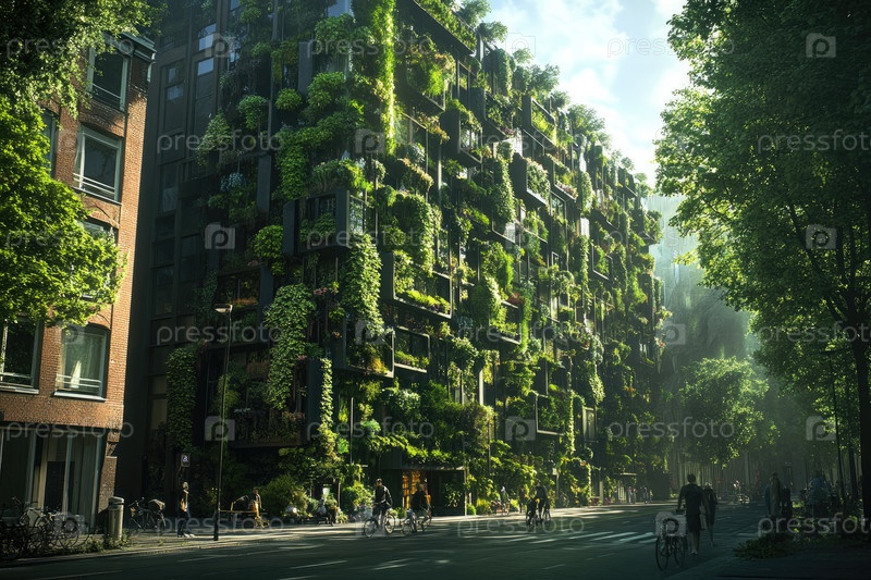 Футуристическое эко-здание, покрытое зеленью с городской уличной сценой и яркой атмосферой