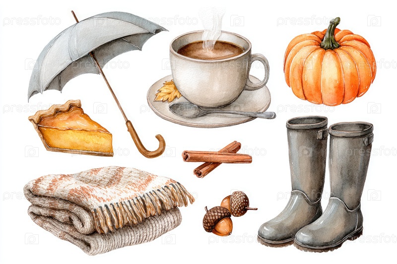 Уютная осенняя иллюстрация показывает возвышающуюся чашку кофе, тыкву, пирог и теплые сапоги в окружении одеяла и желудей, создавая тёплую сезонную атмосферу с копировальным пространством