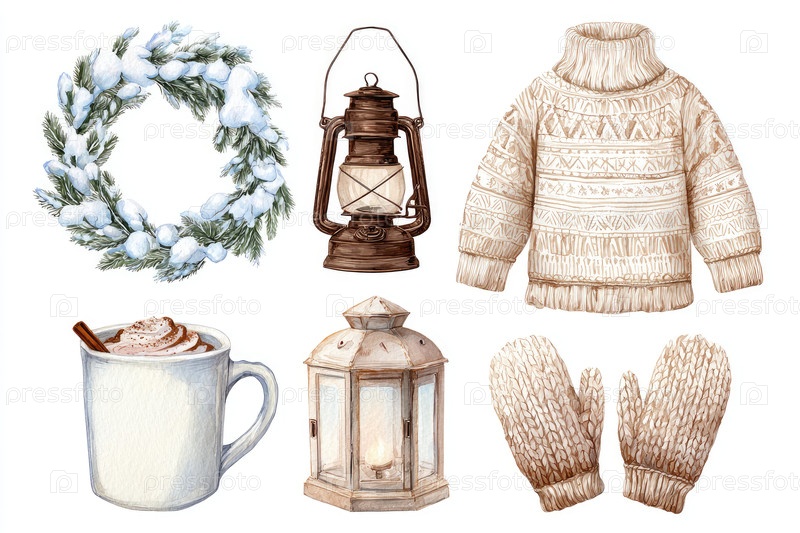 Уютная зимняя иллюстрация, показывающая вязанный свитер, винтажный фонарь, декоративный венок и чашку горячего какао, создает теплую и привлекательную атмосферу с пространством для копирования текста