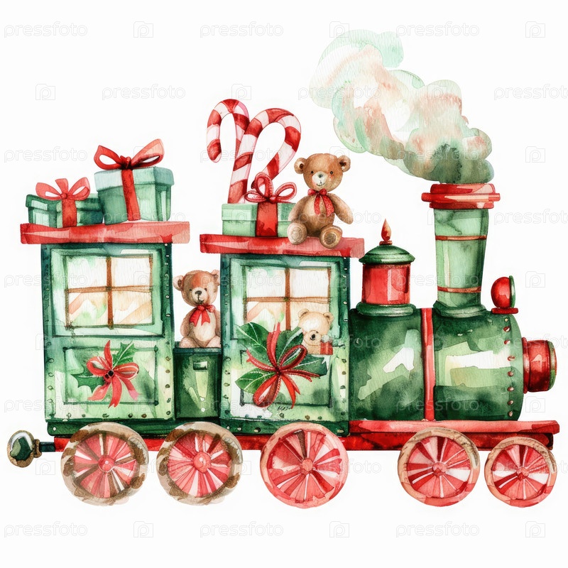 Эта яркая акварельная иллюстрация показывает очаровательный поезд, украшенный подарками и плюшевыми медведями, создавая радостную праздничную атмосферу с красочными деталями и странными элементами