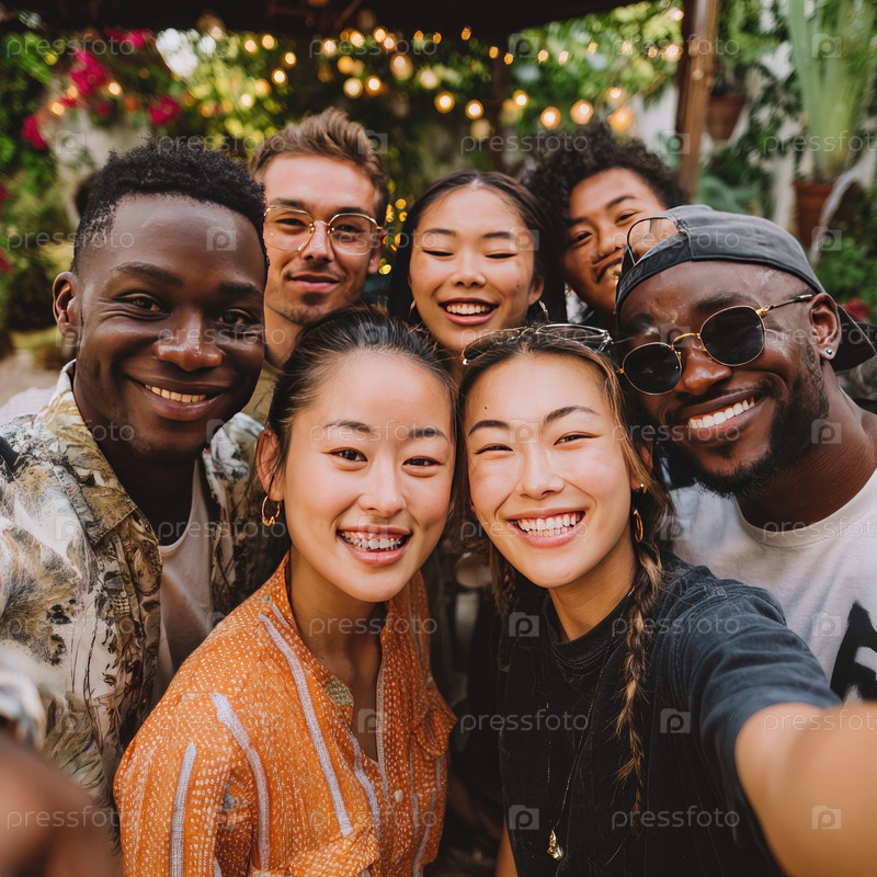 Веселая группа разнообразных друзей позирует для селфи в оживленной обстановке на открытом воздухе, окруженная красочными цветами и мерцающими огнями, захватывая момент счастья и дружбы