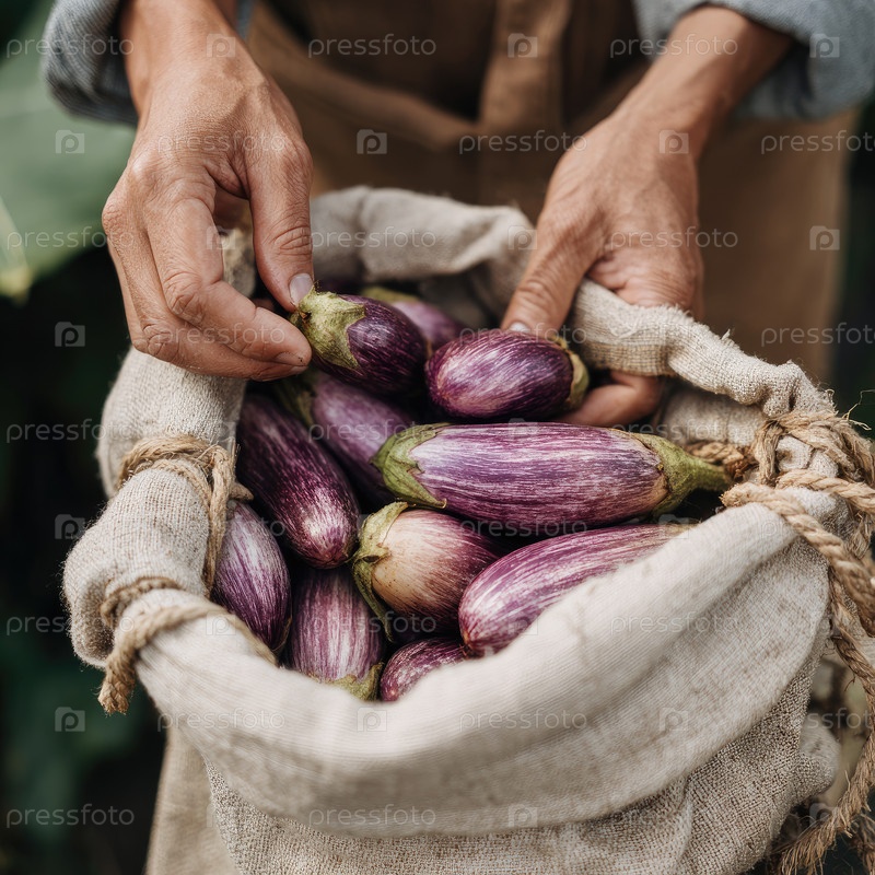 Руки ласково хватают за мешок, наполненный ярко-фиолетовыми баклажанами, окруженные пышным садовым фоном, демонстрирующим красоту свежих продуктов и радость сбора овощей