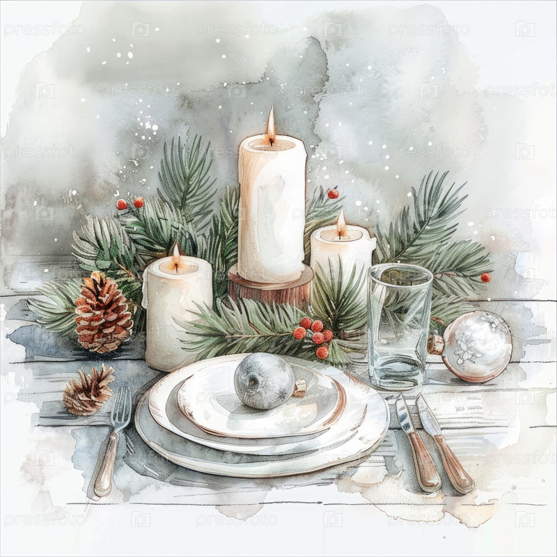 Элегантный зимний стол с белыми свечами, сосновыми ветками и декоративными украшениями создает теплую атмосферу для праздничных собраний, идеально подходит для праздничных торжеств и семейных ужинов
