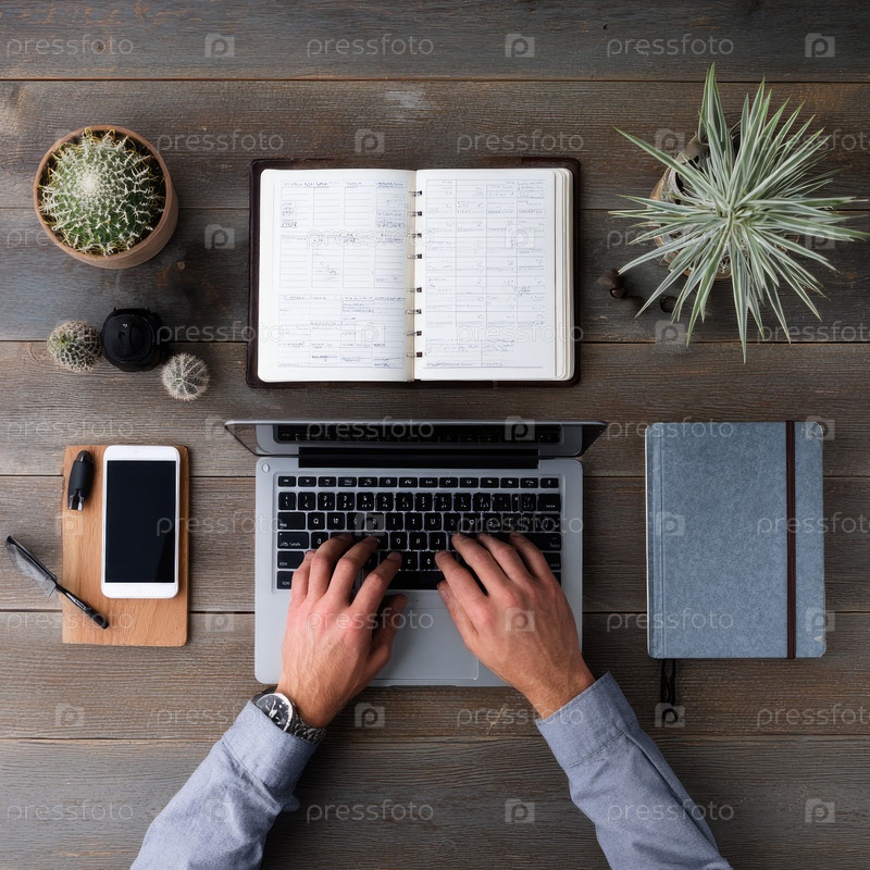 Человеческие руки активно печатают на ноутбуке в окружении планировщика, смартфона и декоративных растений на деревянном столе, создавая атмосферу продуктивного рабочего пространства