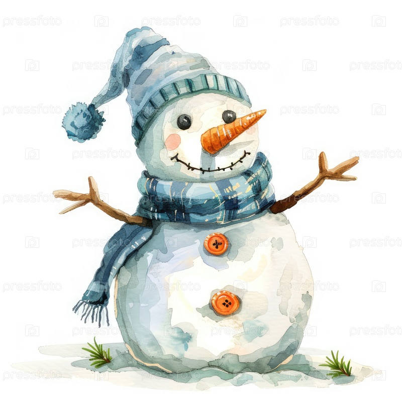 Веселый снеговик, украшенный голубой шляпой и шарфом, стоит в заснеженном пейзаже, демонстрируя дружественное выражение с кнопками и морковным носом, вызывая радостную зимнюю атмосферу