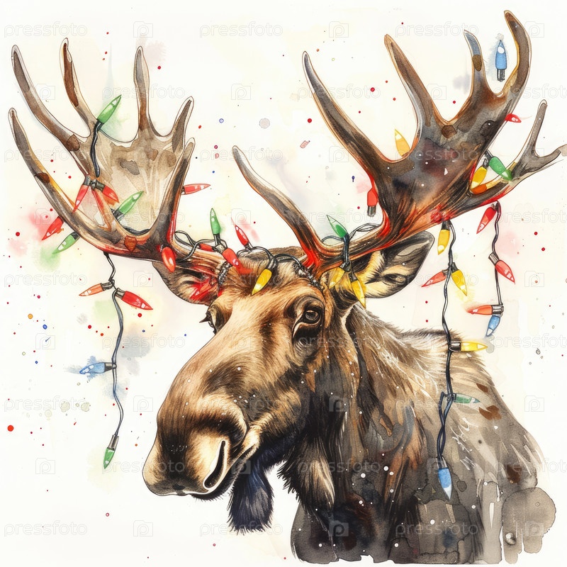 Лось с величественными рогами украшен яркими рождественскими огнями, создавая причудливую и праздничную атмосферу.Илюстрация прекрасно отражает очарование и радость новогоднего сезона