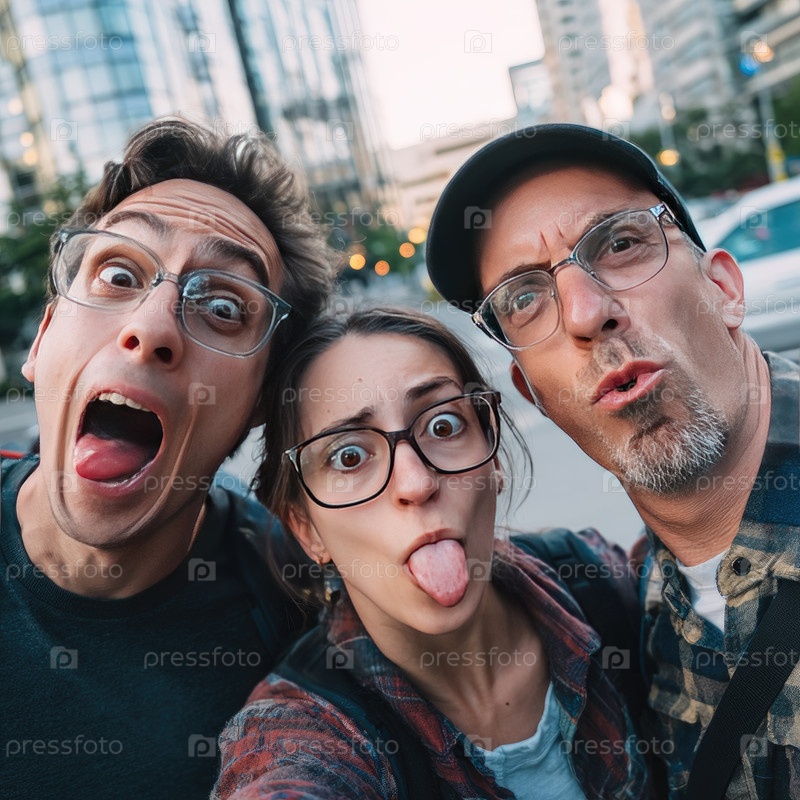 Трое друзей позируют для селфи на свежем воздухе, делают глупые лица и вытягивают языки в оживленной городской среде с современными зданиями и мягким вечерним освещением